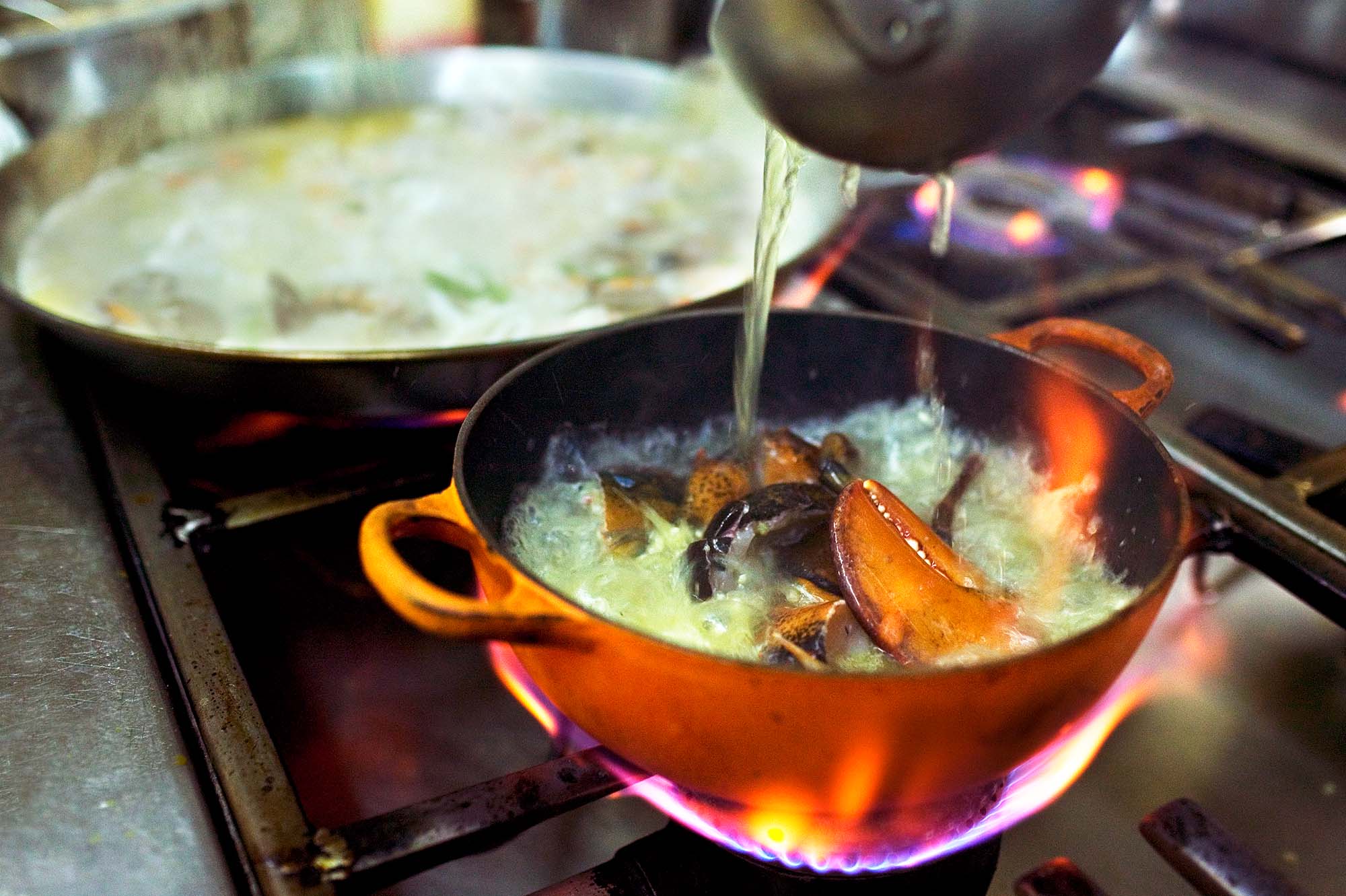 La identidad de nuestra cocina reside en el uso del fuego para finalizar cada plato. Una vez que el grano ha absorbido el fumet, terminamos la cocción con carbón de encina, un proceso técnico que busca resultados específicos que definen la alta cocina marinera.